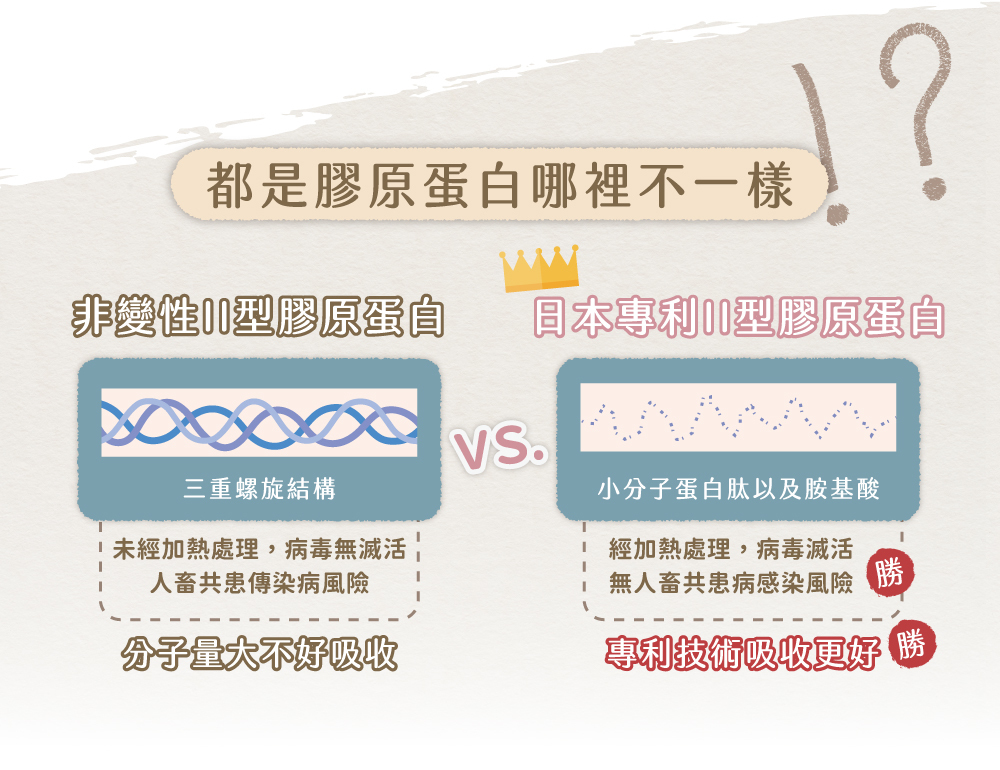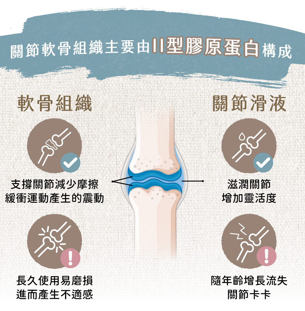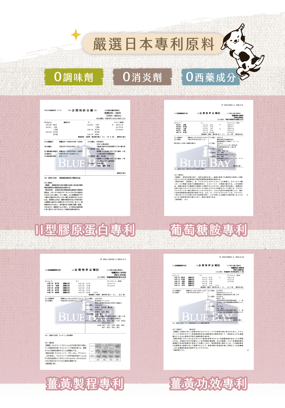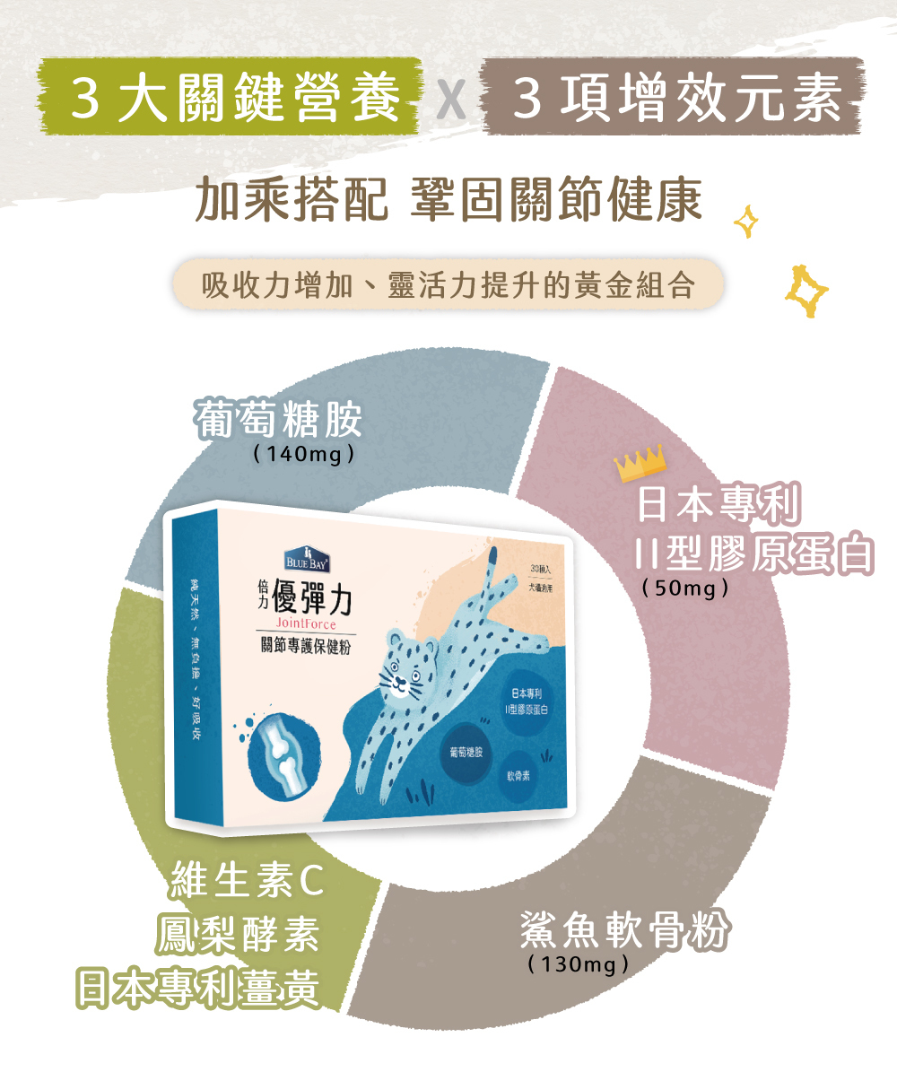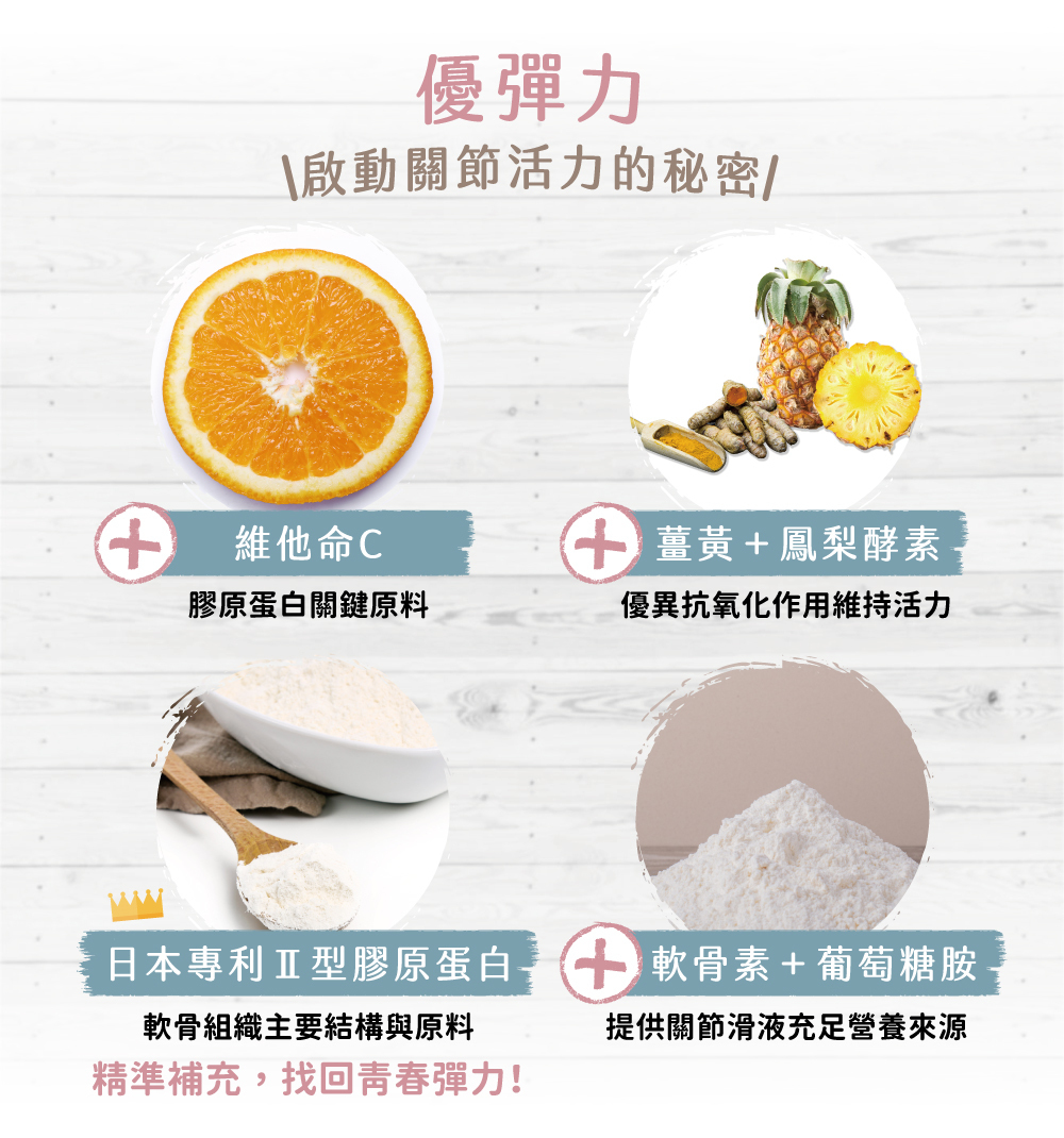 日本NH Food專利II型膠原蛋白(50mg)、N-乙醯型-D-葡萄糖胺(140mg)、鯊魚軟骨粉(130mg)、鳳梨酵素、日本專利微分子薑黃、維生素C、難消化性麥芽糊精