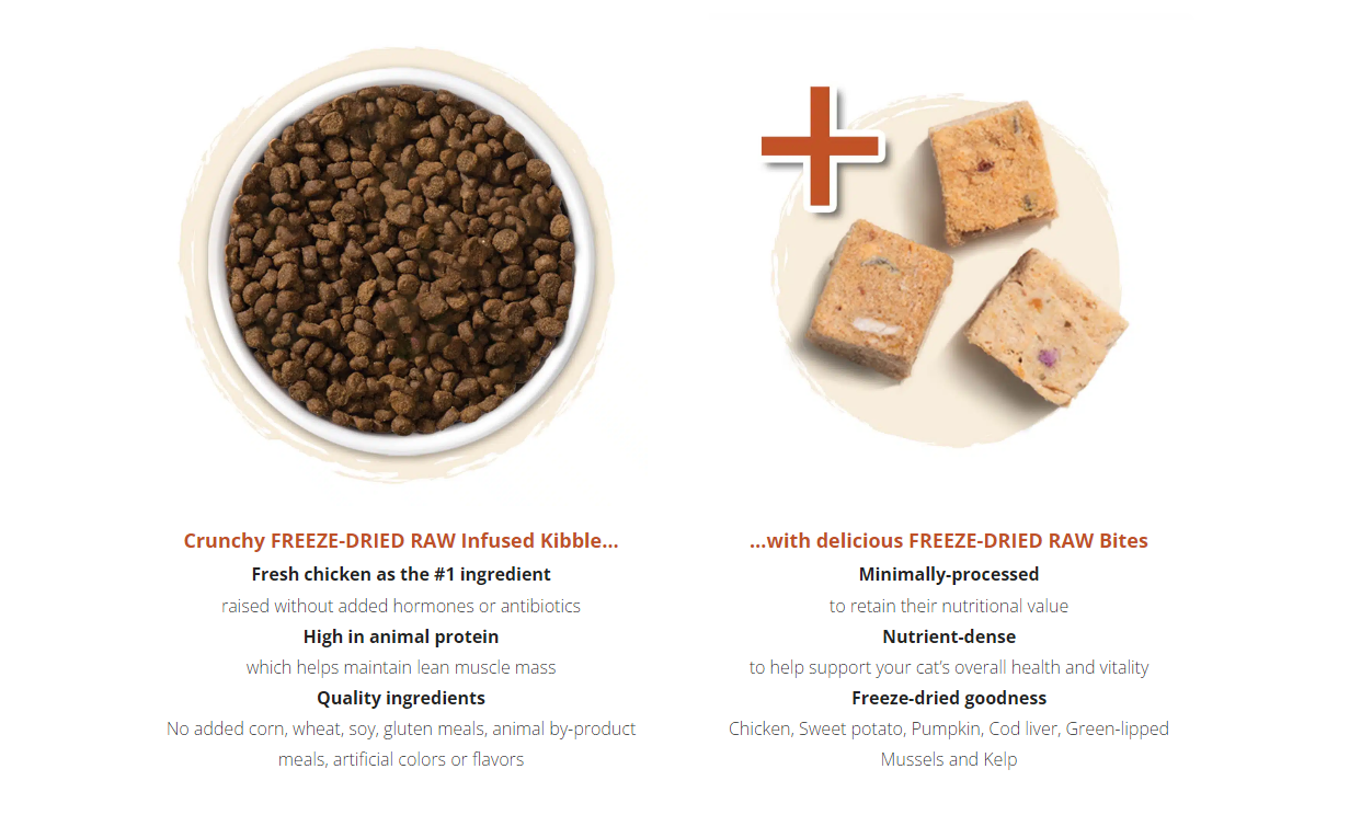 去骨雞肉、雞肉粉、豌豆、扁豆、燕麥片、雞脂(以混合生育酚和檸檬酸保存)、天然雞肉香料、珍珠大麥、冷凍乾燥雞肉、日曬苜蓿粉、氯化膽鹼、豌豆纖維、魚油、氯化鉀、牛磺酸、菊粉、鹽、酵母提取物、鋅蛋白、L-賴氨酸、DL-蛋氨酸、冷凍乾燥甜薯、蘋果、藍莓、胡蘿蔔、蔓越莓、南瓜、生薑粉、維生素E補充劑、鐵蛋白、冷凍乾燥南瓜、L-抗壞血酸-2-磷酸鹽(維生素C來源)、煙酸補充劑、Yucca Schidigera提取物、冷凍乾燥鱈魚肝、冷凍乾燥綠唇貽貝、冷凍乾燥海帶、d-鈣泛酸鈣、錳蛋白、乾燥雙歧桿菌、乾燥屎腸球菌、乾燥嗜酸乳桿菌、乾燥乾酪乳桿菌、葵花油、核黃素補充劑、維生素A補充劑、銅蛋白、鹽酸硫胺、維生素B12補充劑、亞硫酸氫鈉鉀復合物、鹽酸吡哆醇、生物素、芥花油、硒酸鈉、維生素D3補充劑、葉酸、碘酸鈣、迷迭香提取物。