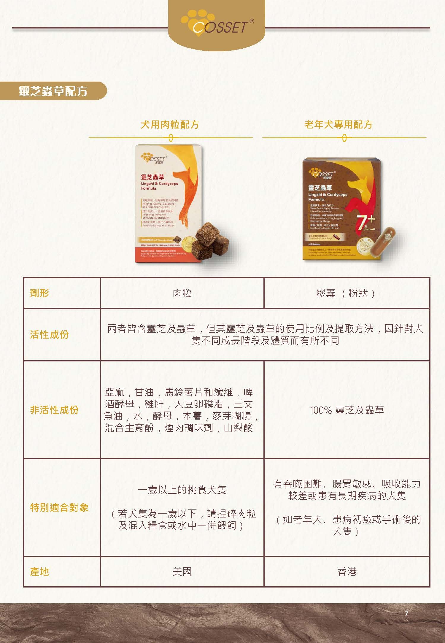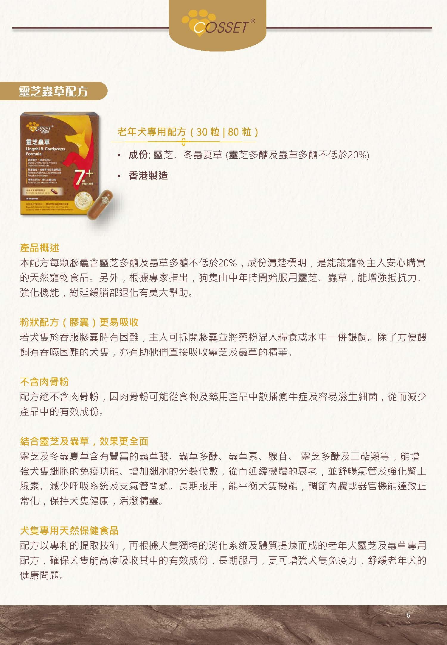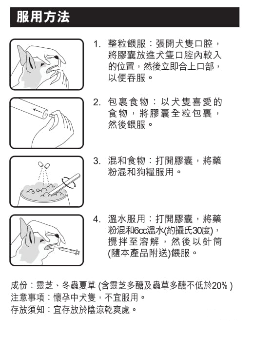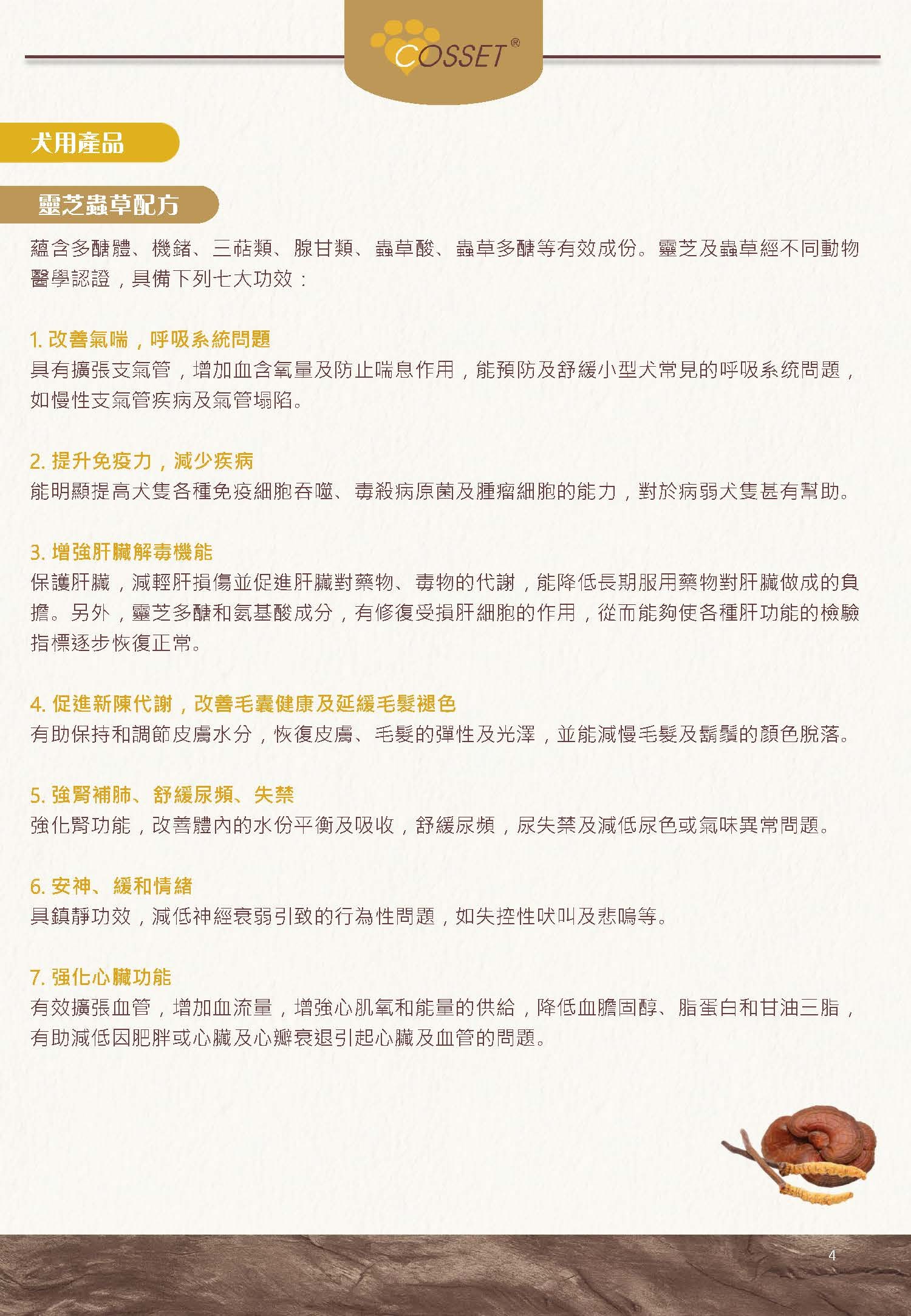 為年老狗隻身體補充、強化及調理,產品結合靈芝及冬蟲夏草內豐富的靈芝多醣、三萜類、蟲草酸、蟲草多醣、蟲草素及腺苷等。經不同動物醫學認證,靈芝孢子及冬蟲夏草具備下列各種功效: