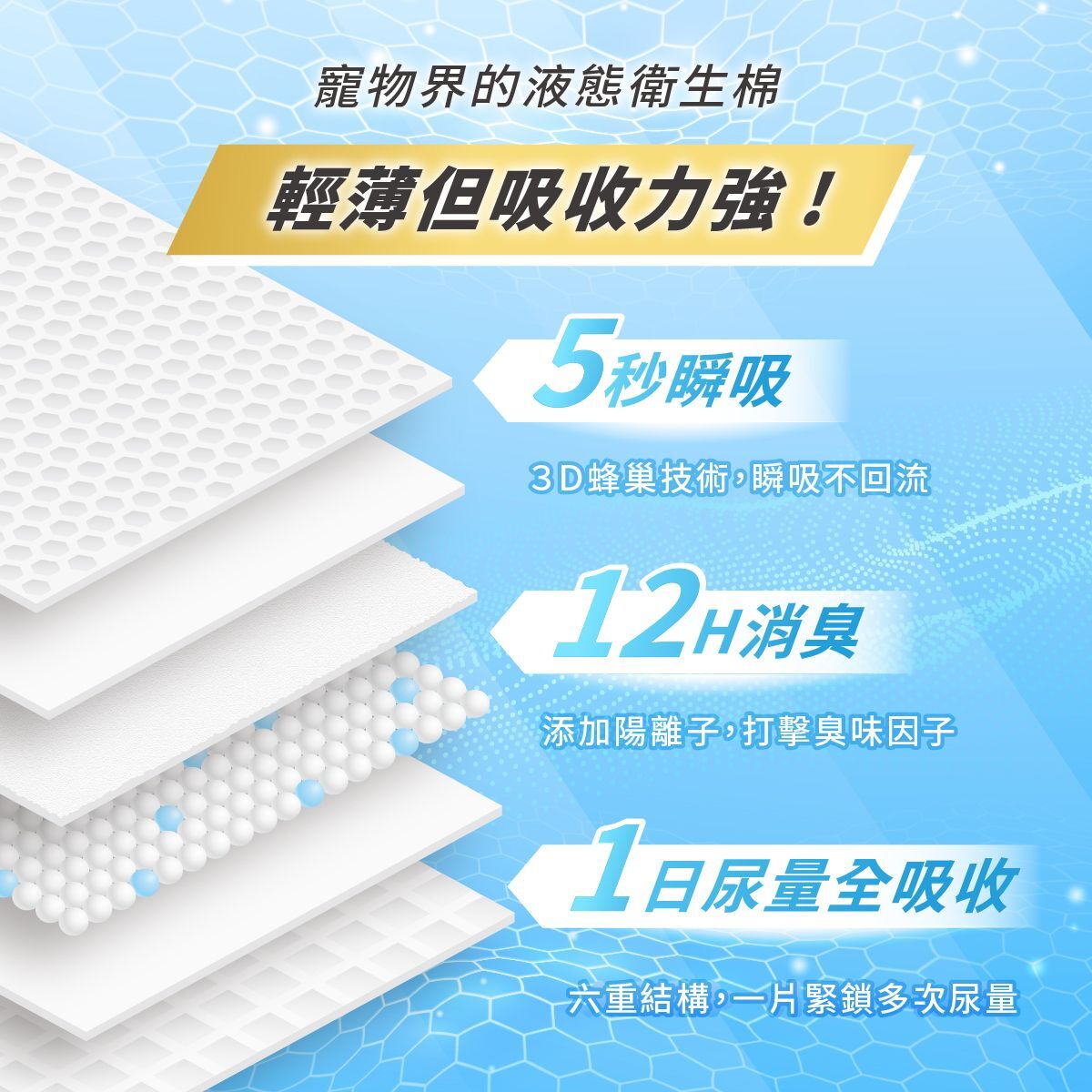 這款寵物尿墊採用獨特設計,能快速吸收並鎖住尿液,保持表面乾爽,有效防止回滲。內含 高效消臭因子,能中和異味,減少環境中的臭味。