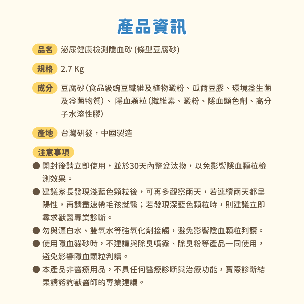 • 使用簡單,倒入砂盆即可監測泌尿健康