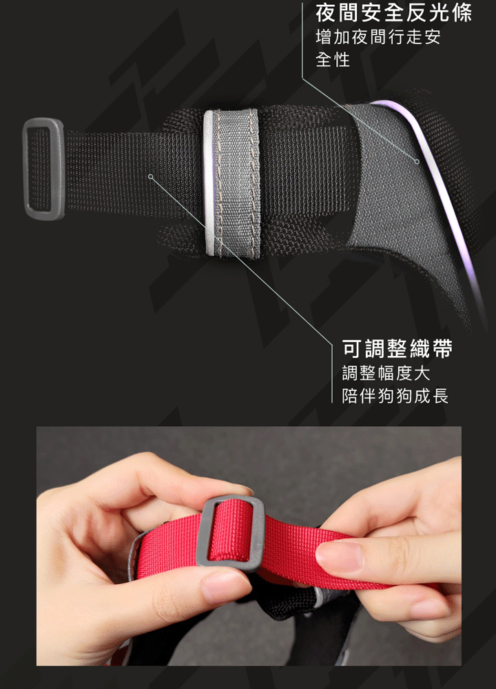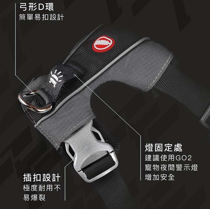 為了夜間安全,背心後部附加了一個環,可固定狗狗燈,並且整體設有反光條。