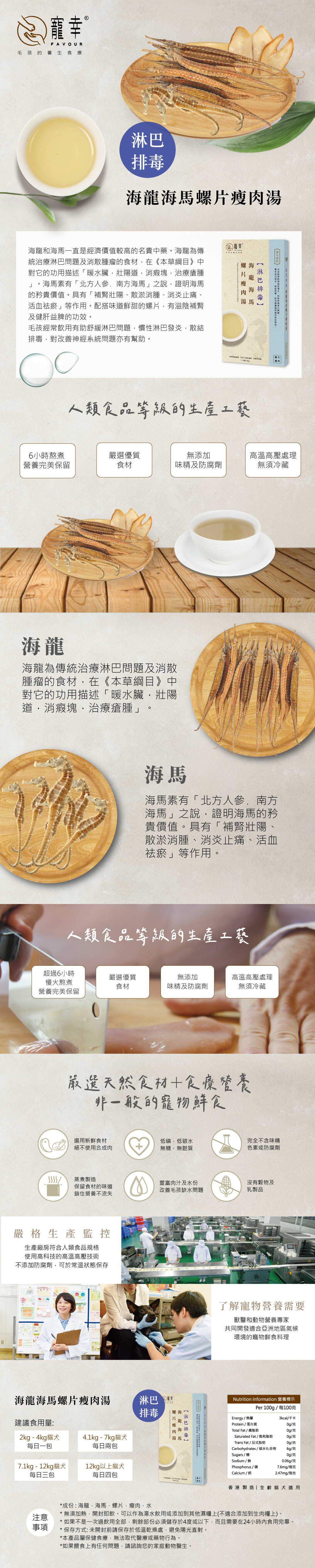 寵幸海龍海馬螺片瘦肉湯,嚴選優質海龍,海馬,螺片及瘦豬肉,遵循古法智慧,六小時熬煮,隔油技術精煉,易於吸收。高溫殺菌消毒,絕無添加味精,防腐劑及色素。