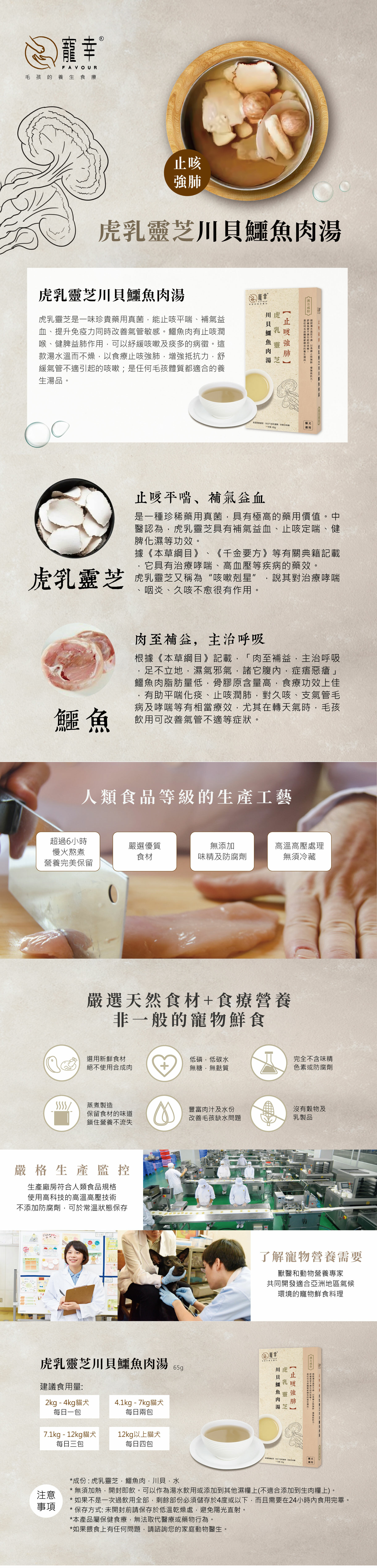 虎乳靈芝是一味珍貴藥用真菌,能止咳平喘、補氣益血、提升免疫力同時改善氣管敏感。鱷魚肉有止咳潤喉、健脾益肺作用,可以紓緩咳嗽及痰多的病徵。這款湯水溫而不燥,以食療止咳強肺,增強抵抗力,舒緩氣管不適引起的咳嗽;是任何毛孩體質都適合的養生湯品。