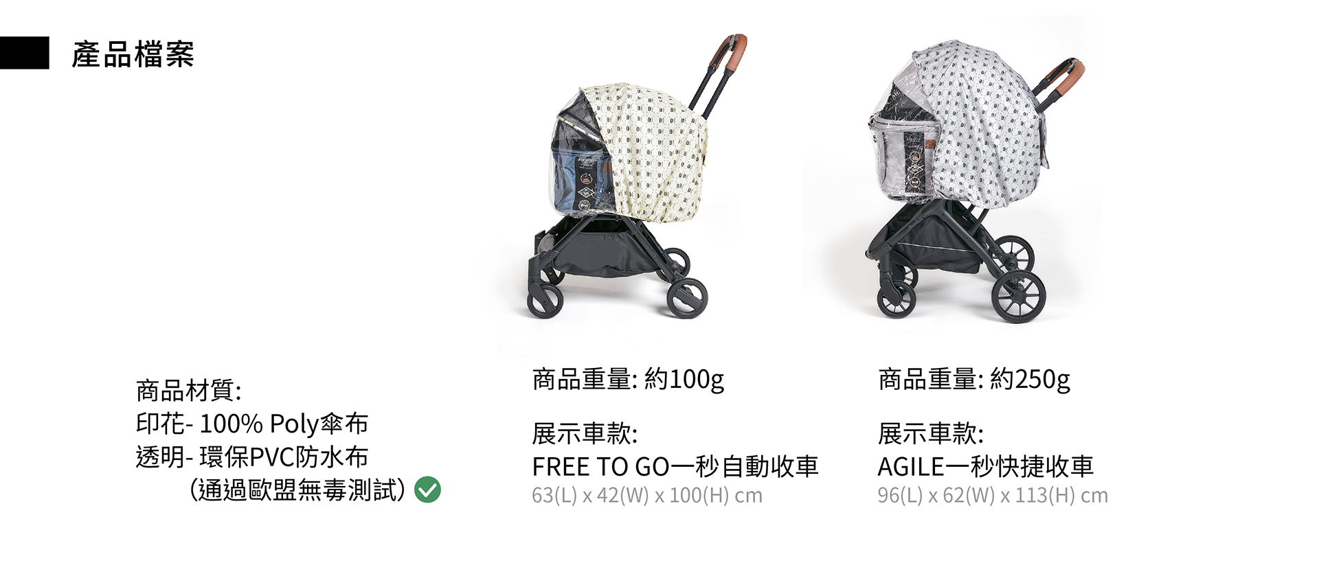 材質: 100% Poly傘布 ; 環保PVC防水布 (通過歐盟無毒測試)