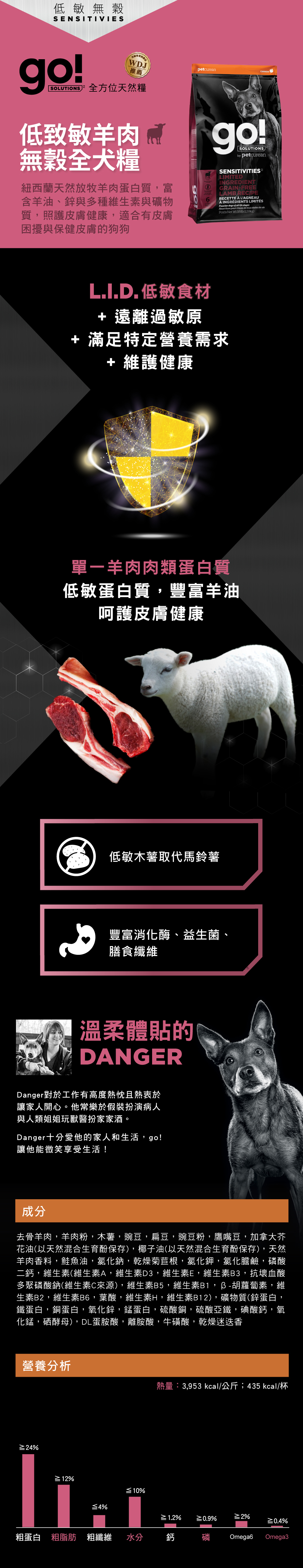 GO! SOLUTIONS™ 低敏美毛系列 羊肉狗糧配方是全新加入抗敏美毛系列的配方,採用高級草飼羊肉為單一肉類蛋白來源及以限定食材作為配方。 抗敏美毛系列適合所有狗隻,特別適合對食材敏感而需要特別膳食照顧的狗隻。