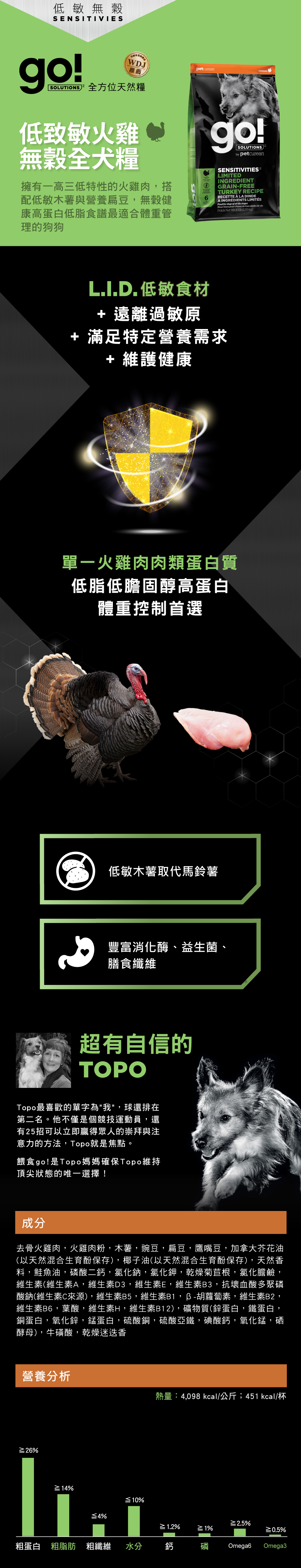 GO! SENSITIVITY + SHINE™ 限定食材 火雞狗糧配方符合AAFCO制定的營養水平,適用於不同年齡及大型犬種(成犬70磅或以上)。