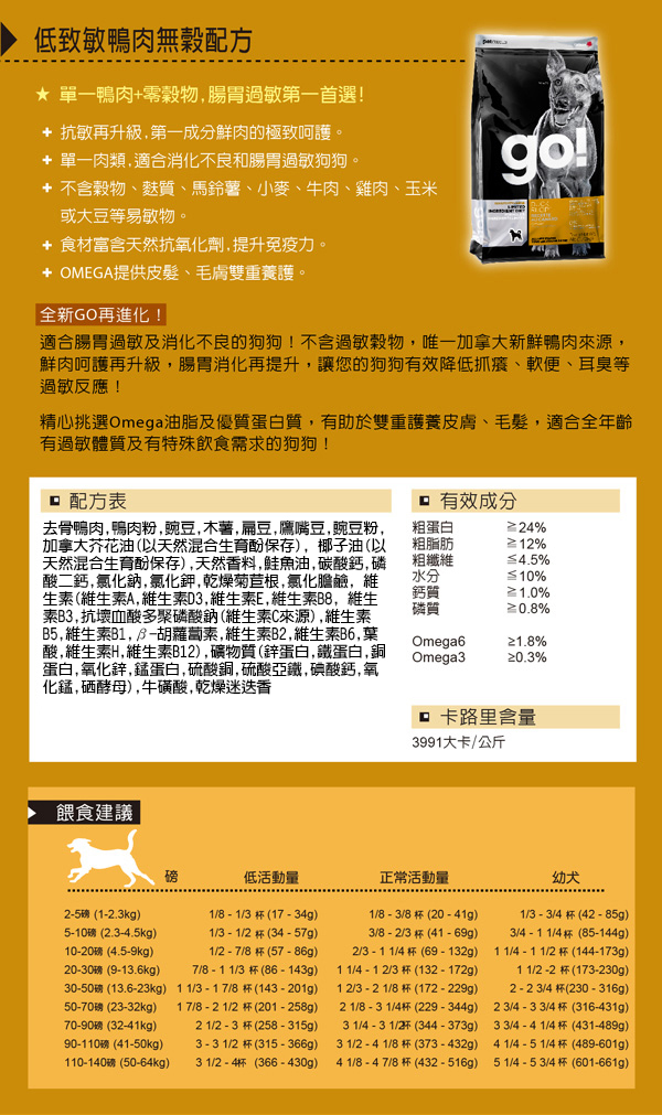 GO! SOLUTIONS™ 低敏美毛系列 鴨肉狗糧配方是全新加入抗敏美毛系列的配方,採用高級鴨肉為單一家禽蛋白來源及以限定食材作為配方。 抗敏美毛系列適合所有狗隻,特別適合對食材敏感而需要特別膳食照顧的狗隻。