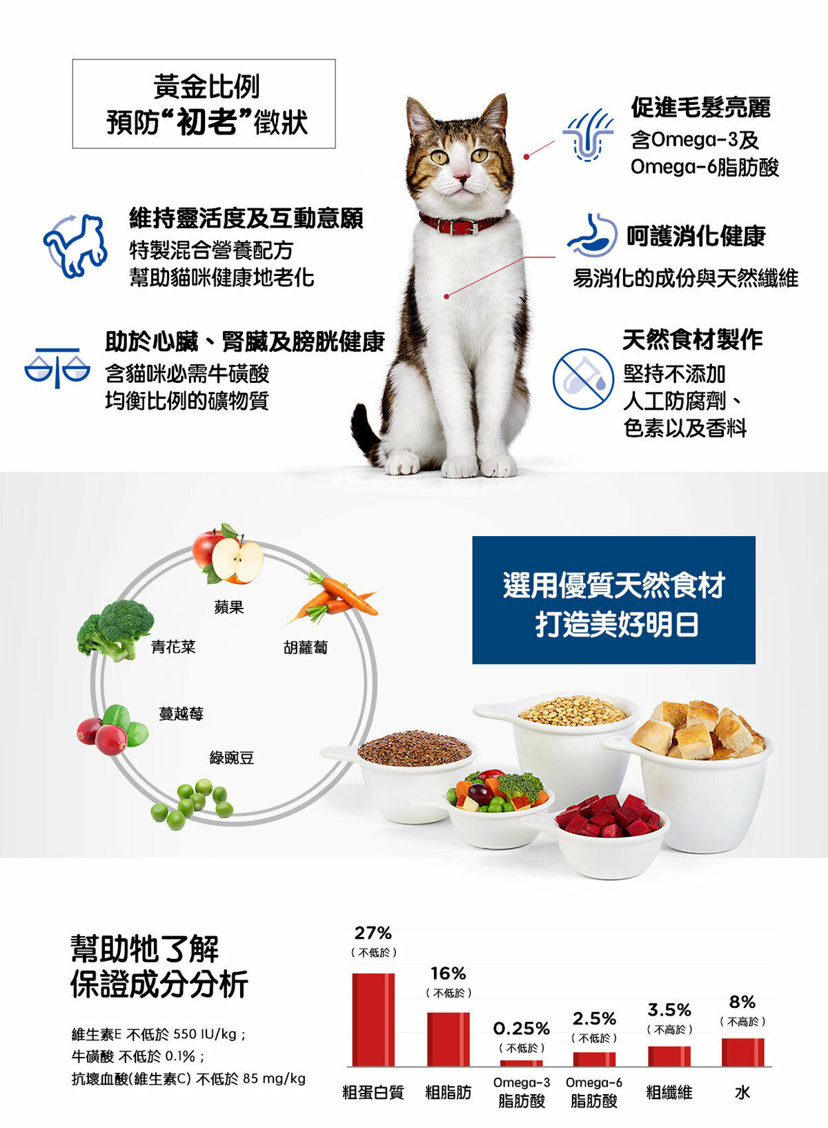 希爾思™寵物食品 高齡貓 7歲以上幫助維持貓咪高齡健康。提供有助於增加精力與活動力的營養混合配方。