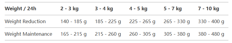 建議餵食時間:直到達到目標體重,並根據需要維持目標體重。建議使用前諮詢獸醫。對於貓咪,開始飲食時建議有一個過渡期。為達到有效的減重或維持理想體重,不應超過建議的每日能量攝取量。能量值:每公斤 3.0 MJ 代謝能(根據 EN 16967)。