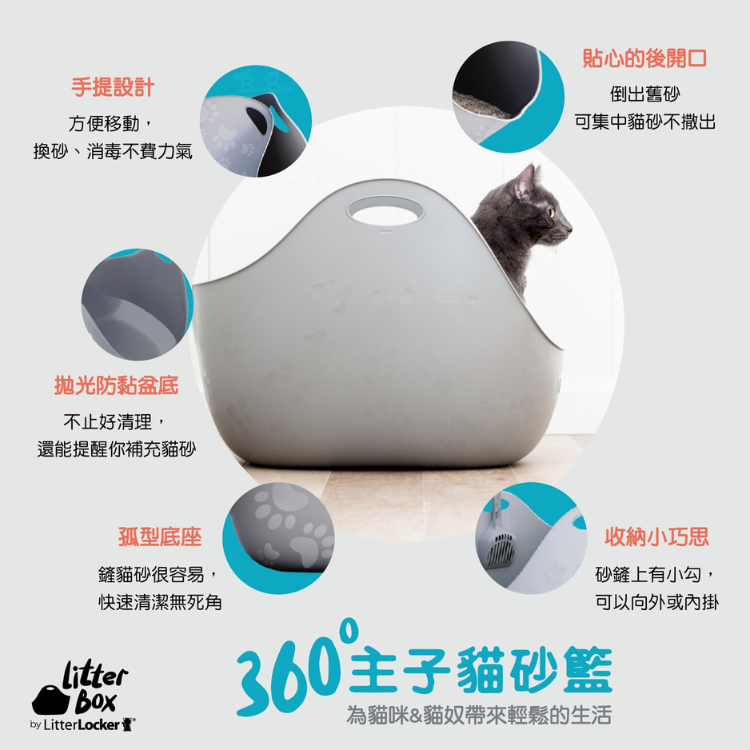 由貓科動物行為專家設計,Educhateur測試,認可。360º開放無死角的視線可滿足貓咪如廁時需保持警戒的天性,進而感到安全,同時還提升掩蓋貓砂的意願。