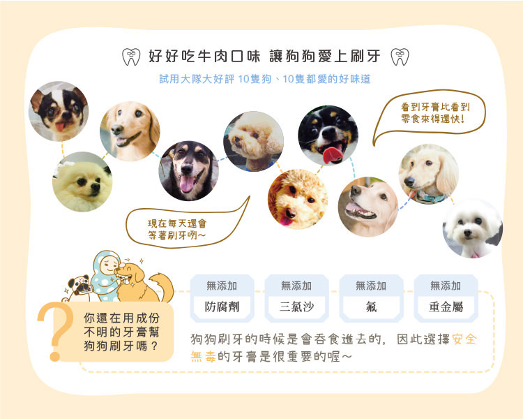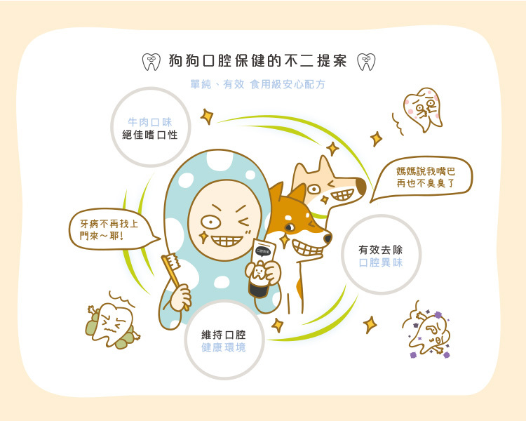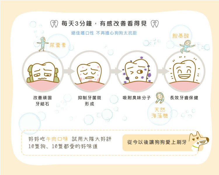專為狗狗設計的牛肉味潔牙凝膠,全成分可食用的安心配方。絕佳適口性讓寶貝更不排斥刷牙,並有效去除口腔異味,獨特添加胺基酸成份,長期使用可幫助去除牙垢,保持口腔健康環境。