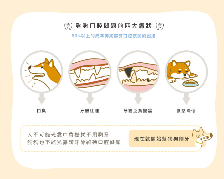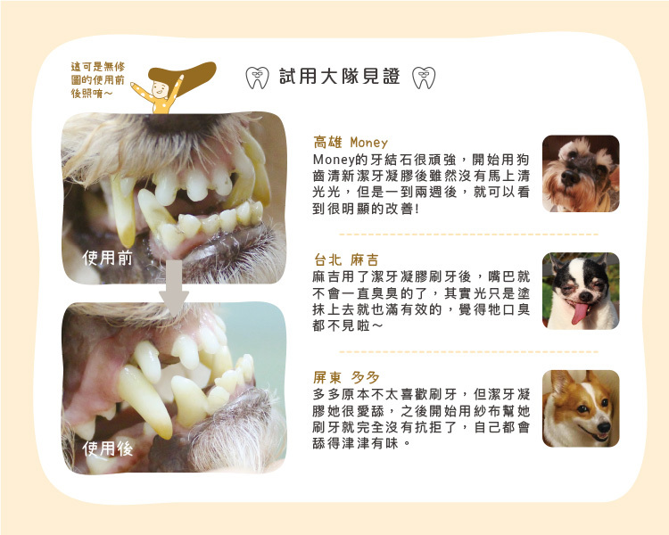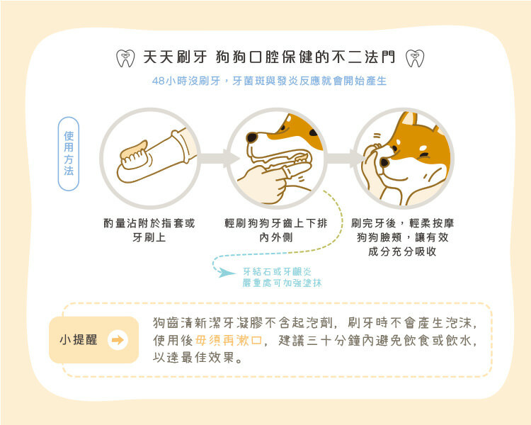 ②輕刷狗狗牙齒上下排內外側牙結石或牙齦紅腫嚴重處可加強塗抹