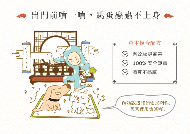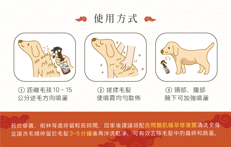 *若於草叢、樹林等處停留較長時間,回家後建議搭配「告別問題肌植萃修復露」清洗全身,並讓洗毛精停留於毛髮3-5分鐘後再沖洗乾淨,可有效去除毛髮中的蟲卵和跳蚤。
