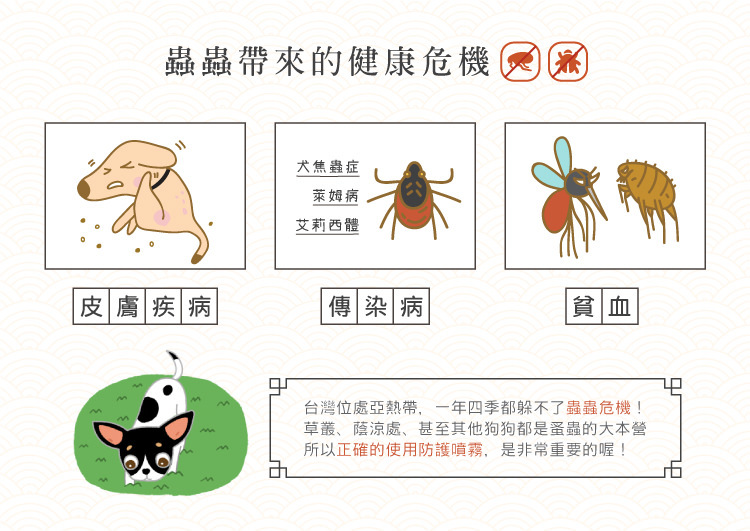 寵物外出前噴灑,可於毛髮肌膚上形成防護環境,使蚤蟲不易上身。