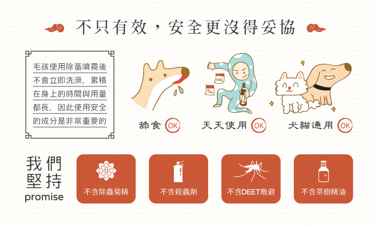 以草本萃取精華有效趨避蚤蟲,干擾害蟲生長機制,使之逃離或逐漸死亡。天然成份溫和不刺激皮膚,安全無毒、舔食無礙。