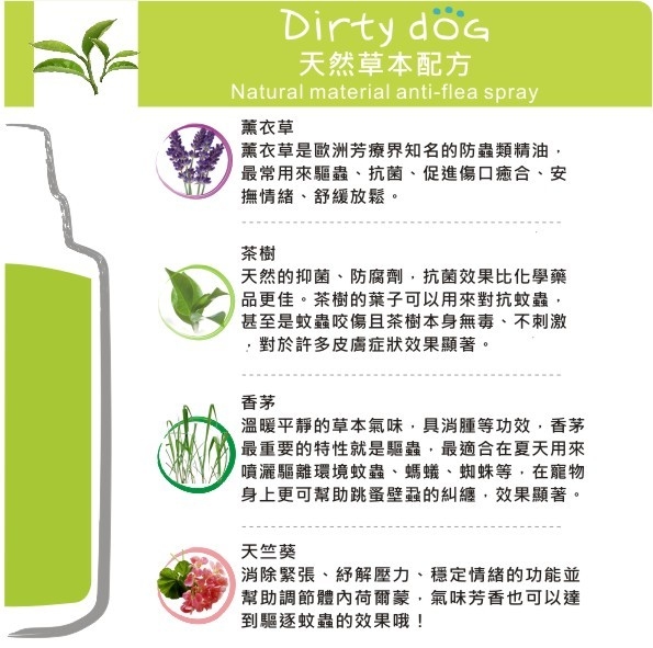 Dirty Dog天然精油防蚤驅蟲噴劑以天然有效的方式呵護寵物,提供您與毛小孩全新的生活品質,享受快樂的無蟲生活。