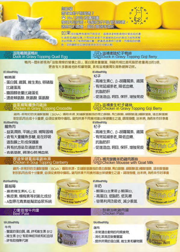 分析成分: 粗蛋白(最小) 7%、粗纖維(最大) 1%、粗脂肪(最小) 1.3%、灰分(最大) 3%、水分(最大) 89%、鈣(最少) 0.1%、磷(最少) 0.08%、鎂(最少) 0.01%、牛磺酸(最少) 0.05%。代謝能:57.58kcal/100g。