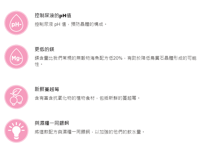 Nutrience Care® 泌尿道改善配方是營養均衡的貓用配方,經過精準配製,有助於維持泌尿道健康。新鮮雞肉、蔓越莓、植物性蛋白質和精心控制的礦物質水平能控制尿液 pH 值,以預告晶體的構成。 除了照顧您的貓貓的特別需求外,Nutrience還更進一步確保狗狗的護理可以透過優質、無麩質的乾糧形式提供,並由健康、有益的食材製成。 此外,這款配方的鎂含量比我們常規的無穀物海洋魚食譜低 20%,有助於降低鳥糞石晶體形成的可能性。