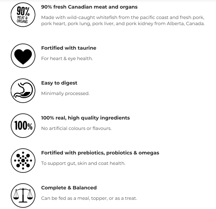 Whitefish, pork, pork heart, pork lung, pork liver, pork kidney, cranberries, fish oil, apples, ginger, pumpkin, sweet potatoes, mixed tocopherols (a preservative), salt, dried kelp, zinc proteinate, copper proteinate, manganese proteinate, dried Bacillus coagulans fermentation product.