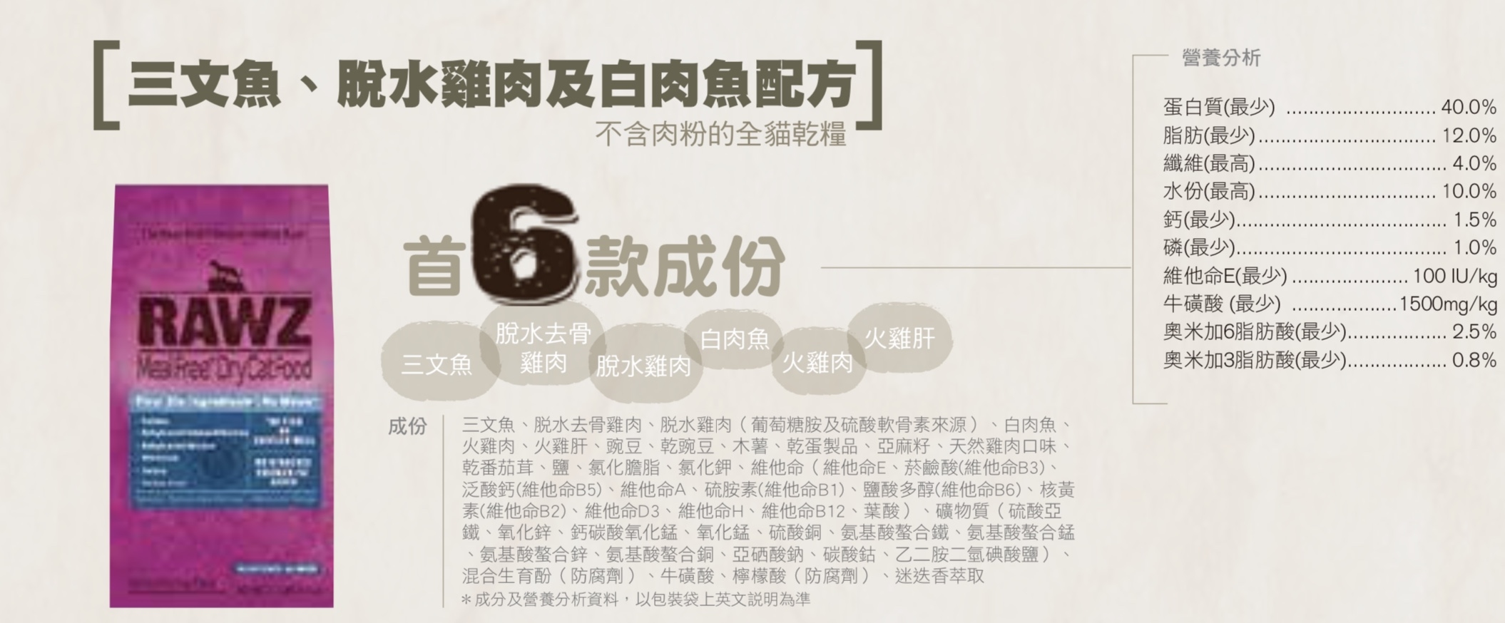 三文魚、脫水去骨雞肉、脫水雞肉(葡萄糖胺及硫酸軟骨素來源)、白肉魚、 火雞肉、火雞肝、豌豆、乾豌豆、木薯、乾蛋製品、亞麻籽、天然雞肉口味、乾番茄茸、鹽、氯化膽脂、氯化鉀、維他命(維他命E、菸鹼酸(維他命B3)、泛酸鈣(維他命B5)、維他命A、硫胺素(維他命B1)、鹽酸多醇(維他命B6)、核黃素(維他命B2)、維他命D3、維他命H、維他命B12、葉酸)、礦物質(硫酸亞鐵、氧化鋅、鈣碳酸氧化錳、氧化錳、硫酸銅、氨基酸螯合鐵、氨基酸螯合錳、氨基酸螯合鋅、氨基酸螯合銅、亞硒酸鈉、碳酸鈷、乙二胺二氫碘酸鹽)、混合生育酚(防腐劑)、牛磺酸、檸檬酸(防腐劑)、迷迭香萃取