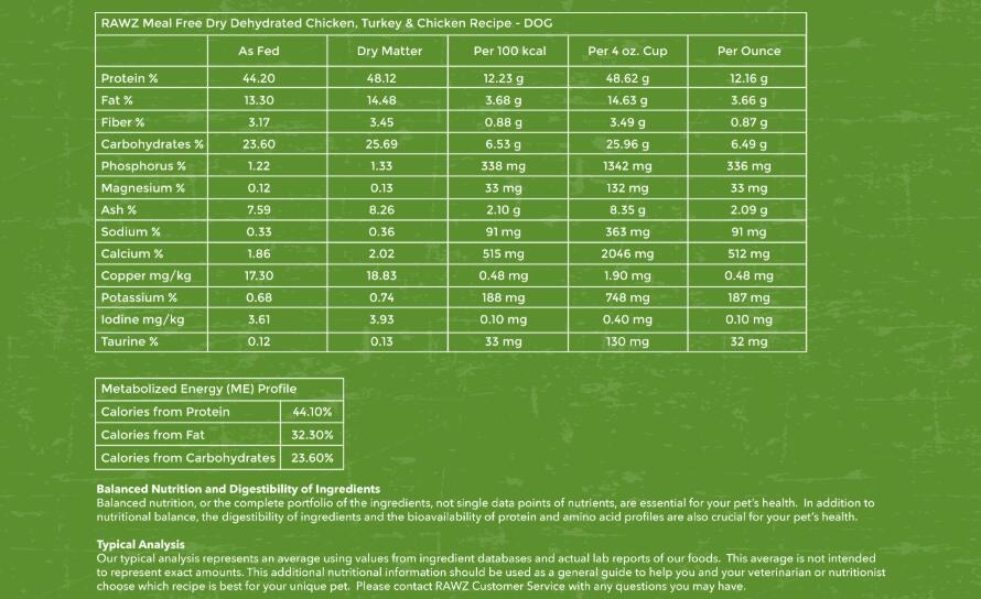 RAWZ 頂級全犬糧,不含肉粉配方,只使用脫水雞肉作為天然濃縮蛋白質來源,相比一般使用肉粉的糧食,RAWZ脫水雞肉含較高的P.E.R值 (Protein Efficiency Ratio 蛋白質效率比率)。以低溫慢煮方式,有助保留食物中的蛋白質及氨基酸,保持蛋白質處於更自然的狀態。