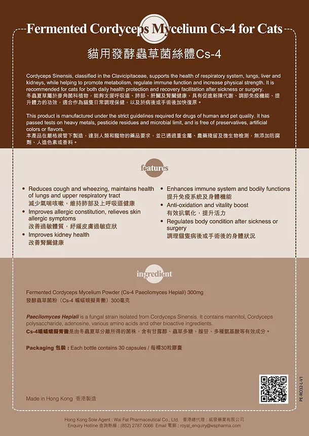 Royal-Pets貓用發酵蟲草菌絲體Cs-4在嚴格規管下提取,達到人類和寵物的藥品要求,並已通過重金屬、農藥殘留及微生物檢測,無添加防腐劑、人造色素或香料。
