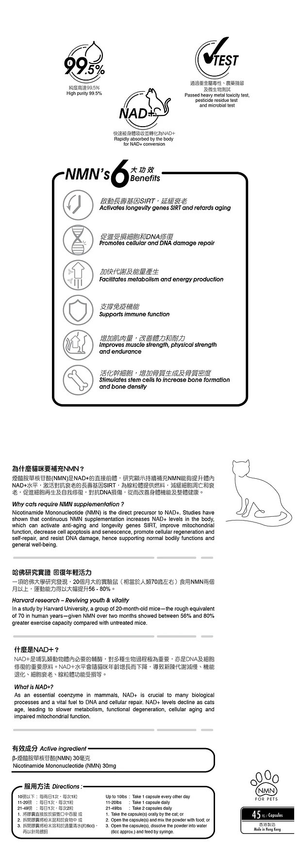 本產品含有高純度、高穩定性的NMN,能迅速進入貓隻身體再轉化成NAD+,發揮抗氧化、抗衰老功效,改善貓隻體質,提升活動能量,讓您心愛的毛孩活得更健康快活。