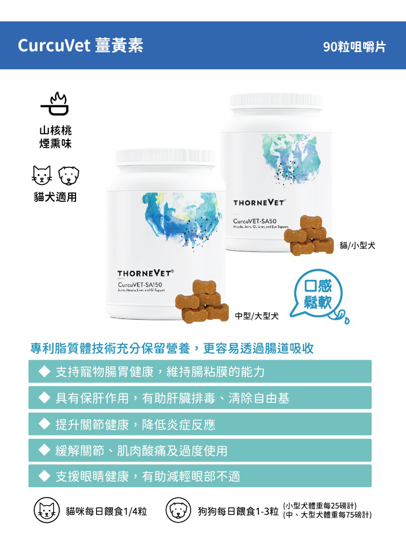ThorneVet CurcuVet-SA150 薑黃素是為狗狗專用的寵物薑黃素。薑黃素是薑黃(咖哩的主要成分)中的天然橙色色素,是一種強大的抗氧化劑,對關節健康、肝臟支持、胃腸道健康和心血管功能有諸多好處,因為它有助於維持動物的正常細胞因子平衡。然而,在人類和寵物中,薑黃素很難被血液吸收。 而 CurcuVET® 是一種獨特且獲得專利的薑黃素提取物,僅從 ThorneVET 獲得,與其他形式的薑黃素相比,它是一種明顯更好吸收的薑黃素形式。研究表明,CurcuVET 有效助寵物維持健康炎症反應;例如,曾有一項歐洲研究發現,CurcuVET 可有效幫助狗隻維持健康的細胞因子平衡。