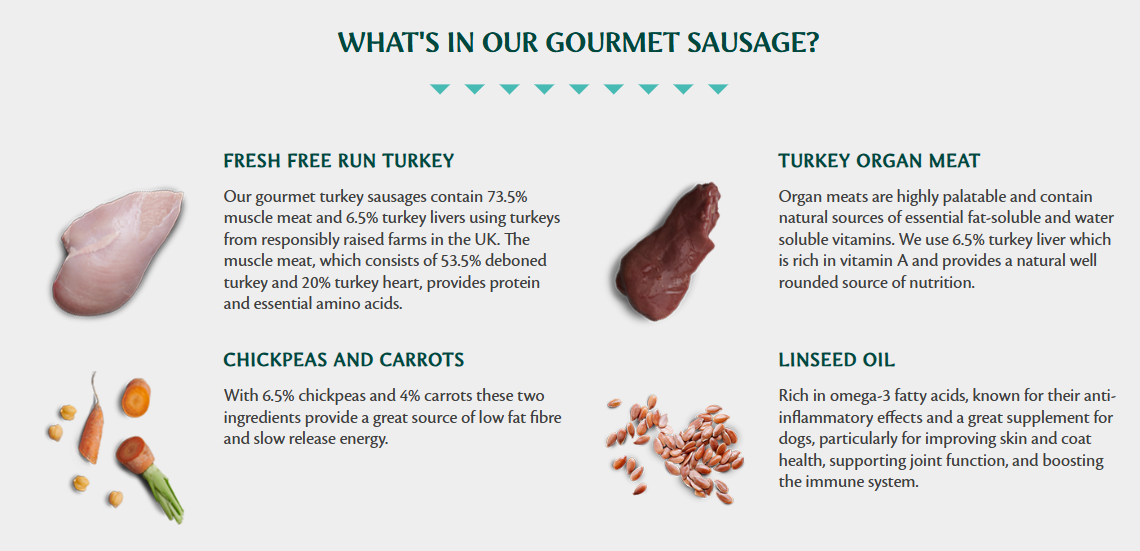 Fresh Turkey 80% (meat and organs), Parsnips 4%, Chickpeas 4%, Minerals, Linseed Oil
